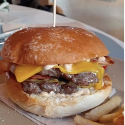 Envuelta en pan de búrguer brioche, nuestra hamburguesa de ternera se acompaña de bacon en láminas bien crujientes, queso chedar en cada capa de la hamburguesa y nuestra única salsa Turis coronando esta creación. Todo ello, como no, acompañado con abundantes patatas fritas.