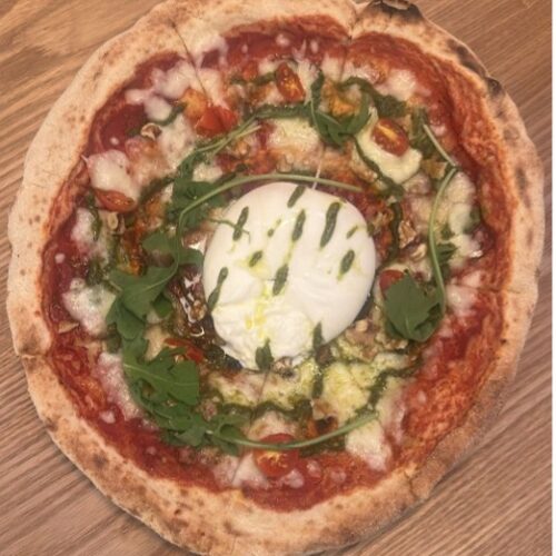 De entre todas nuestras pizzas elegimos la de burrata porque no te va a dejar indiferente, es una pizza inigualable por su fusión de sabores, con una base de tomate y pesto, cada ingredicente utilizado por nuestra cocina hace de esta pizza algo esecial, el secreto, los tomates Cherry, rúcula, nuez molida y la mejor de las burratas.