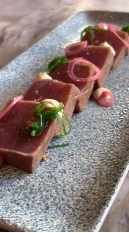 En nuestra cocina, tras pasar una pieza entera de atún por la sartén durante muy poco tiempo y con el fuego muy vivo, obtenemos este tataki que nos permite apreciar la intensidad del atún, casi crudo, con la acidez de una marinada que potencia su sabor, un pescado presentado sobre cama de parmentier de patata y coronado con una salsa de mayosoja irresistible.